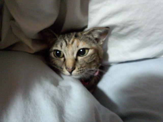 押入れに猛ダッシュしたので、探すと布団の間から顔を出したチョコ。
