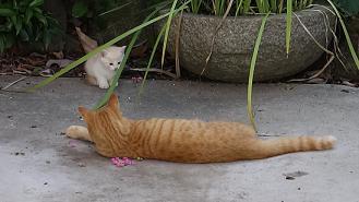 庭に残った三毛猫は、母猫と茶虎兄さんの更に強い守りで、簡単には近づけず引き離せないようになっていた。