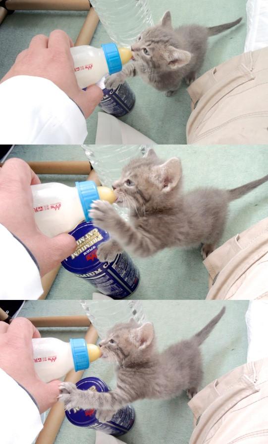 昨日、ミルクを飲むところの写真をご覧になりたいとのリクエストがあったため、今日は仕事をちょっと抜け出して自身の手でグレイに直接ミルクを与えてきました。
