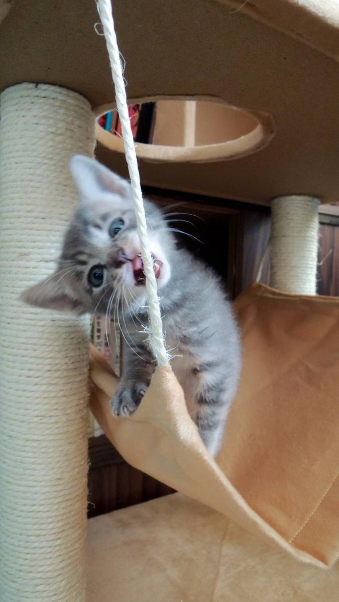 また「にゃんこ玉」で遊ぶとやや興奮状態となるのか、猫タワーのハンモックにも自ら登って、吊り下げているヒモをガジガジと噛み始めました。そのうち、噛み切られてしまいそうだなあ(´▽`;)