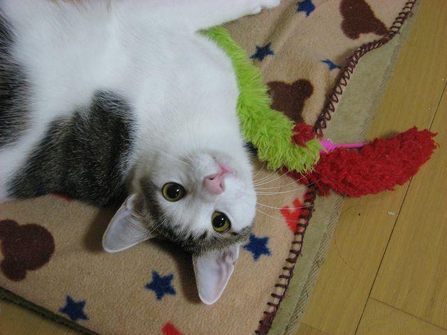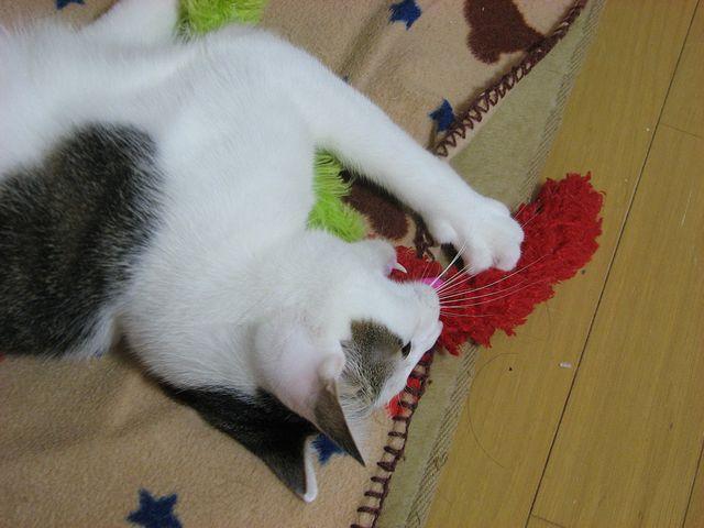 写真は、ホットカーペットの上で楽しそうにひとり遊びするルカくん。