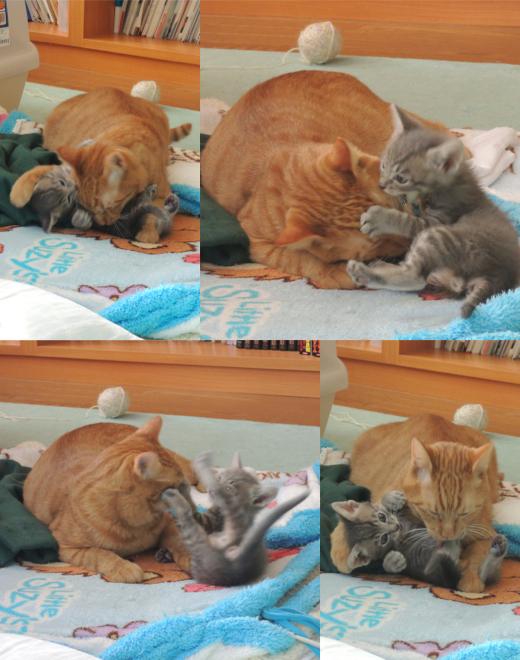 顔を猫キックされても、耳や瞼を噛まれても激高せずにやさしく舐め舐めして、強く咬まれすぎれば、ガブッと咬み返しています。すぐさま舐め舐めしてアメとムチを使い分けている様子。勉強になりますね(*´▽`*)