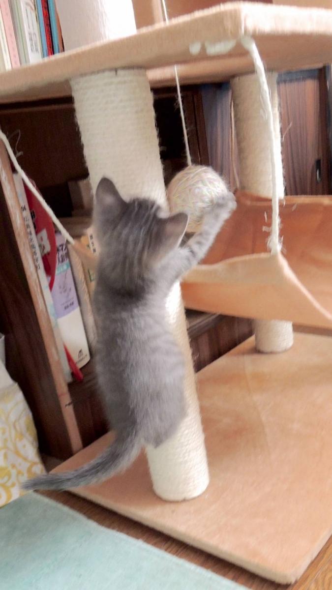 「にゃんこ玉」も吊ってグレイの前で振り子にした方が食い付きがよいことを昨日報告しましたが、さらに猫タワーに「にゃんこ玉」を持っていくと、一緒について登るようになりました。