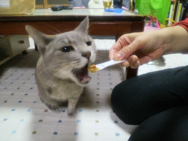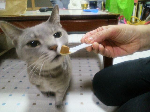 娘「ネコジお友達のラグドール猫ちゃんみたいにスプーンで上げてみる!!」