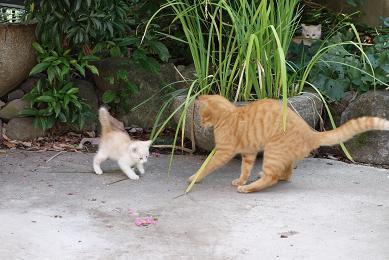 後ろの木陰で様子を伺う子猫ちゃんは、家の中でもこんな感じ~
