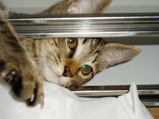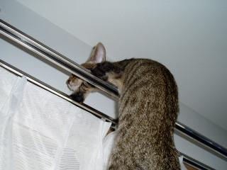 レースのカーテンに爪をかけ(レースが!!)