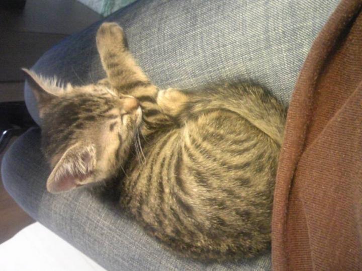 探検のあとは、毛づくろいして、わたしのひざでスヤスヤ、、、。