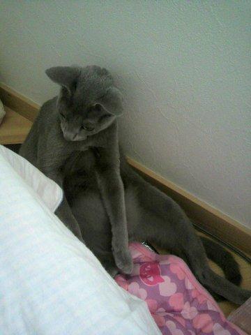 セイといきなり一緒にするわけにもいかないので、子猫だけ別室に隔離したんですが、ドアを閉めて姿は見えないのにセイはシャーシャー!フゥーフゥー!威嚇したり、低く唸り声をあげながら落ち着きなく駆け回って、尻這いとでもいうのでしょうか・・・あちこちにお尻をなすりつけ(マーキング?)、威嚇し続けたあげくに嘔吐まで(´Д`;)