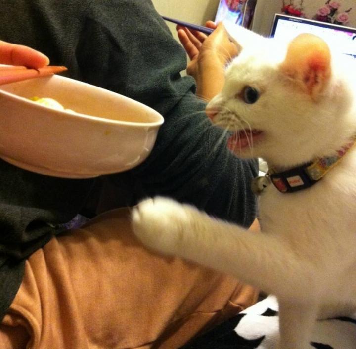 アッガイは、私たち夫婦がご飯を食べ始めると、かならずイソイソ出てきて、「ボクも!」と言わんばかりに、食事をしている私の膝の上にお座りしてます。