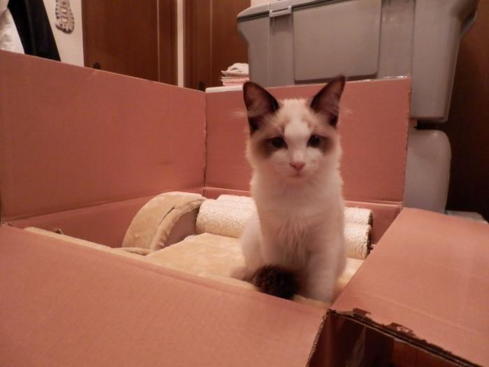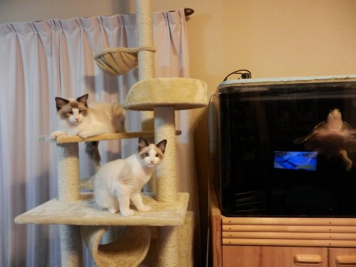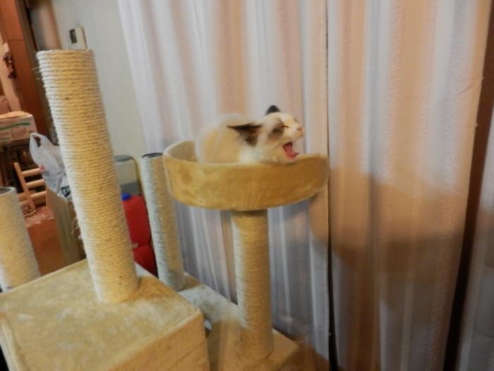作業途中で気が付くと早々我慢できずにレオ君がタワーに登ってました。