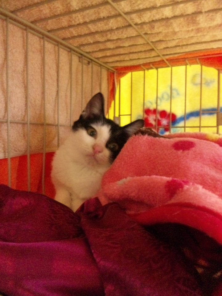 12月1日に一時預かりを引き受けたモモちゃん。まだシャーシャーは言いますがだいぶ慣れてきて、ケージの中ではありますが、おもちゃを見せると遊ぶようになりました。