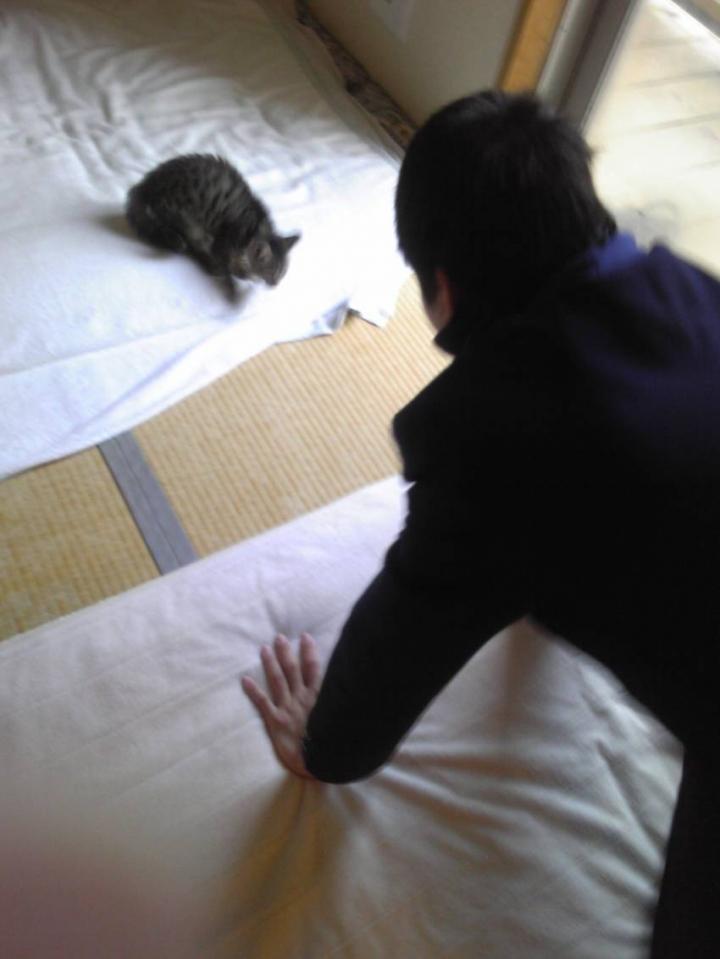 次男が四つん這いになると、マリンも戦闘体勢に!いつもしっぽが3倍くらいにふくらむ。
