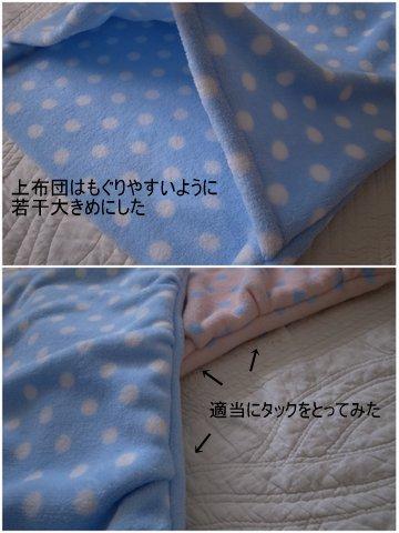 もぐりやすいように端からちょっと離して毛布を取り付け、入っても窮屈すぎないようにタックをとってみました。