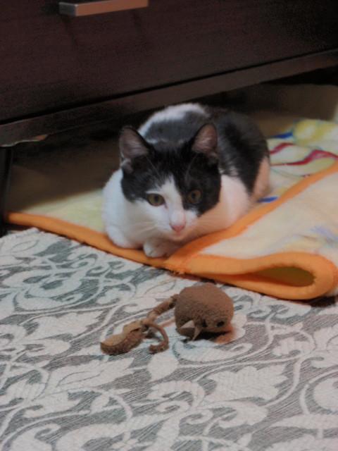 基本たんすの下かソファーの下に隠れているのですが、おもちゃで遊んだりするときは出てくるように。。。