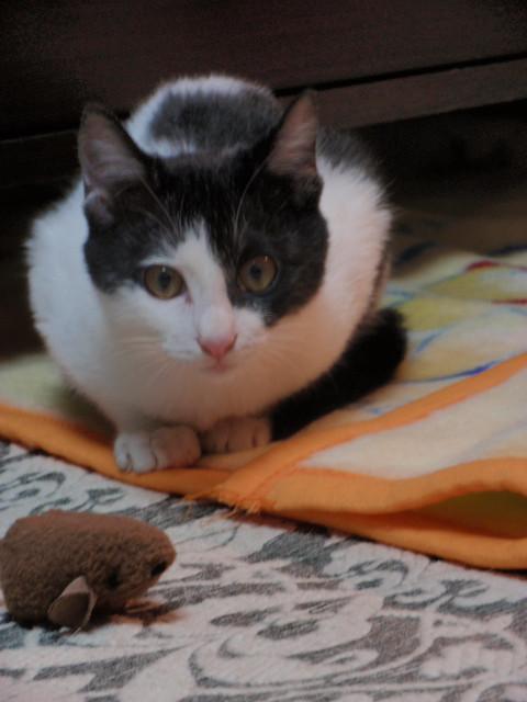 警戒しつつも匍匐前進で部屋の中を探索。夜はおもちゃで遊びました。