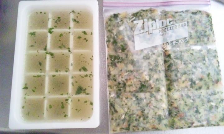 スープはこれまた製氷皿に入れ、野菜は袋に入れて冷凍保存。