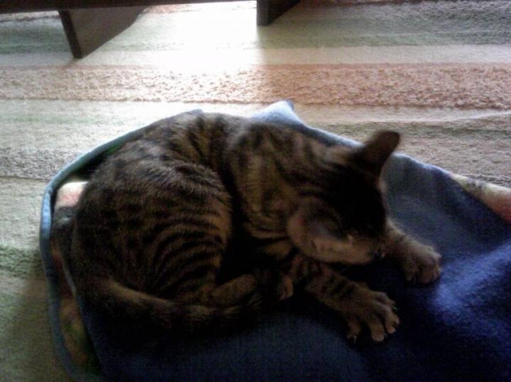 朝からひと暴れした後は、やはりお気に入りのプーさんひざかけフミフミして、ごろごろ、、、、