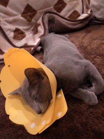 ごはんのときと、トイレのとき、毛づくろいしたそうなときにカラーを外してあげたら、気持ち的に落ち着いたのか普通に昼寝したり、再度カラーをはめるときも嫌がらずにさせてくれたからひと安心♪