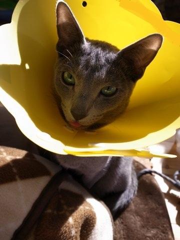 エリザベスカラーがとっても邪魔で嫌みたいで、いつもの昼寝場所であるこたつに入りにくいのが原因のひとつかも。