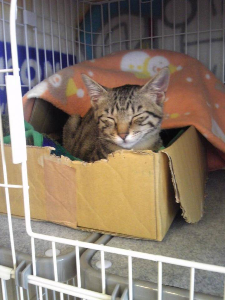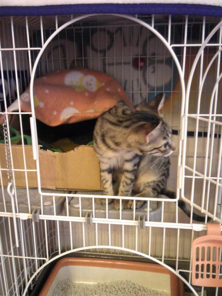 前のケージ(ボランティアの方からお借りしてたもの)のときは、夜だけ入って(というか、入れて)お昼寝はもっぱらプーさん毛布だったのに、昨日は、自らケージでお昼寝(-_-)zzz
