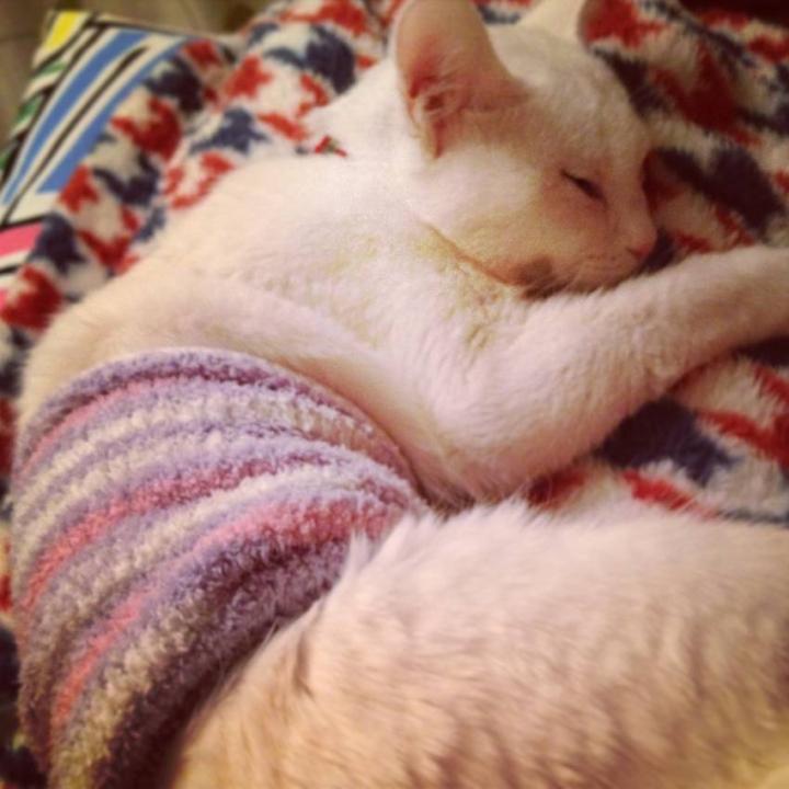 無事に手術が終了して、帰って来てからは落ち着きなくって、傷口舐めたり、糸を取ろうとしてたので、先生に教えてもらった靴下を切って作る腹巻を装着!