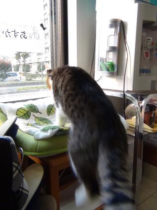 急いでいつもの窓際に飛び乗る福ちゃん