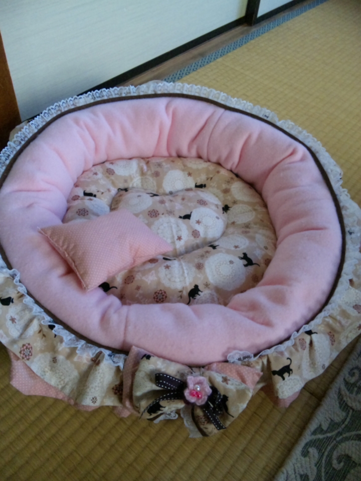 クッション仕様でしかも猫がらの布に真中はハートの型。写真にはありませんが、冬用でクッションの上にピンクの毛布までつけてくださいました。その毛布はヘンリーがソファーの下で寝るときに使用しています。とても凝ったつくりでフリルやレースがあしらわれていて、枕つき!猫にも快適なデザインで本当に素晴らしいんです~!大感激でした。