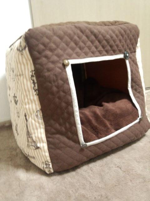 帰宅後は家にあった余り布でロワのドームベッドを作製★