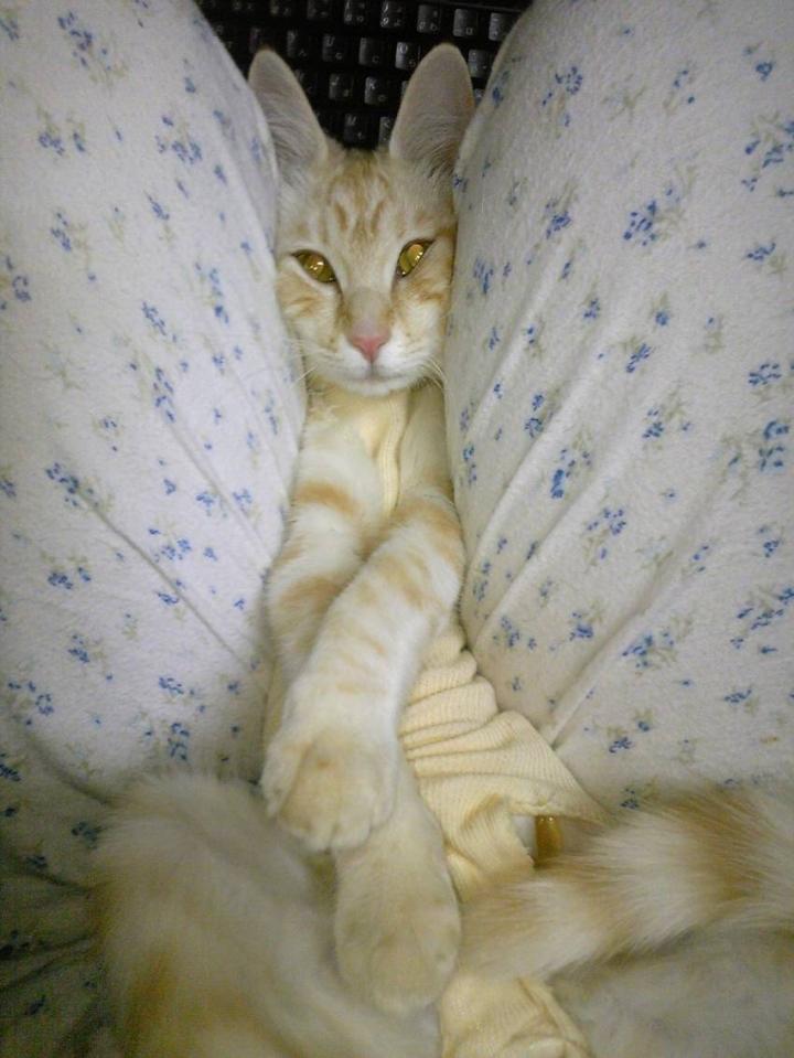 椅子の上で△座りしてる太ももの間に挟まって喜んでます。