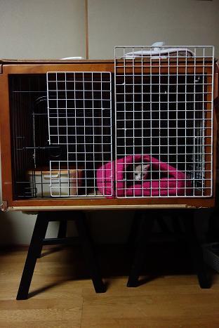 夜の間、タマをこたつ、花子をケージに入れたら鳴き続けて