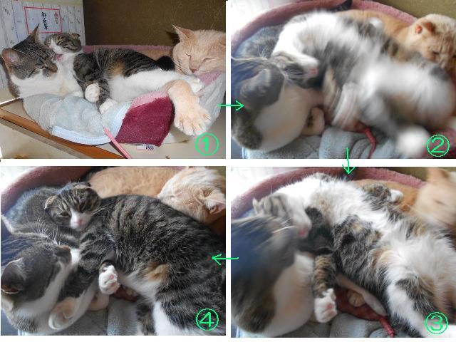 でもまだまだ寒いので猫たちは固まって寝ています。