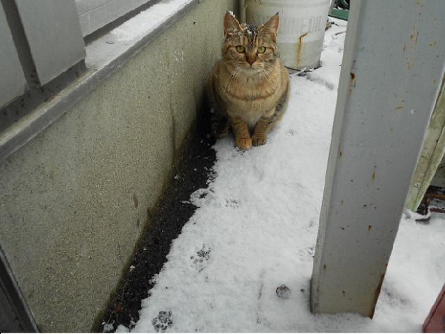 ベットの中でぬくぬくしている3匹に比べ、寒そうなさっちゃん。