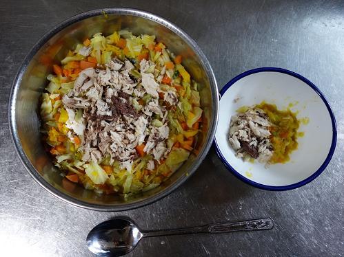 ニャンコ、8:2。魚が多めです。野菜はすり潰します。