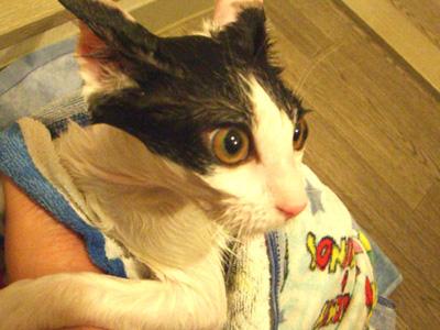 先に濡れ猫になった、兄たんと遊びたくてウズウズしている。