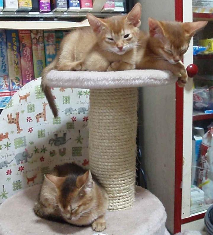 我が家には8匹の猫がいます。日本猫3匹、アビシニアン5匹(6/10に3匹の子アビーズ誕生^o^)実家でも6匹の猫がいます(日本猫3匹、アメショー3匹)^^;しかも、9/24にアメショーが6匹の子猫を出...