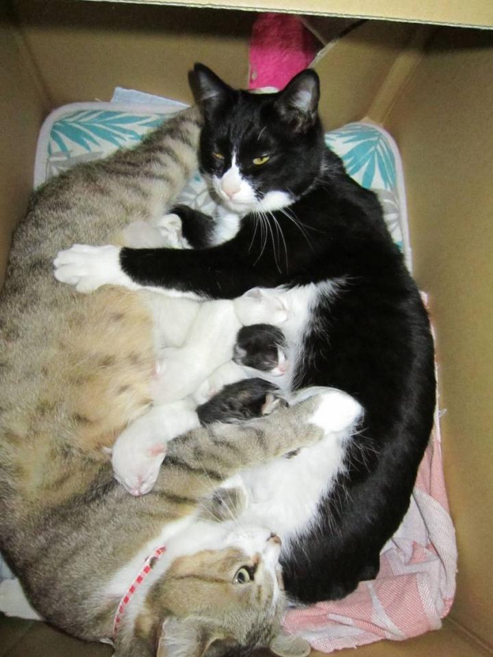 母猫2匹で、同じ箱に入って7匹の赤ちゃんを育てています。