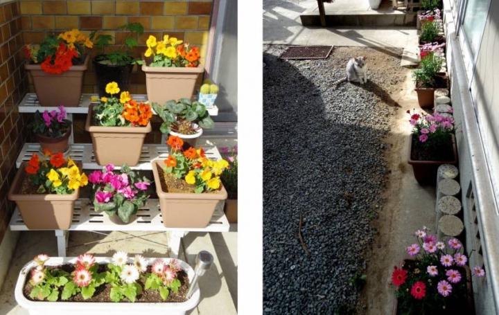 ・まばらになったペチュニアを玄関近くに集約して植える。
