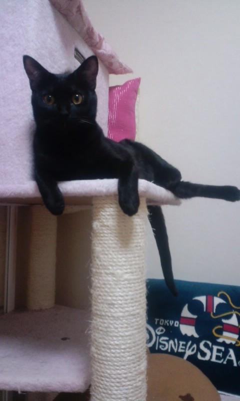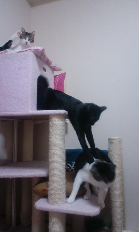 遊んでもらいつつ、2段目を守って満足げなモコ