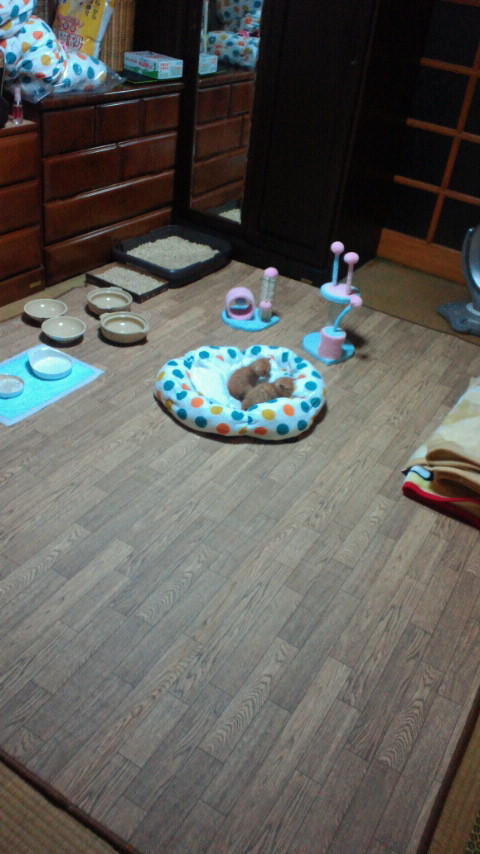 家のリビングはタイルカーペットをひいているので、トイレトレーニング中はリビングと寝室に隣接した和室の六畳間にフローリング調のホットカーペットをひいて猫部屋にしております。