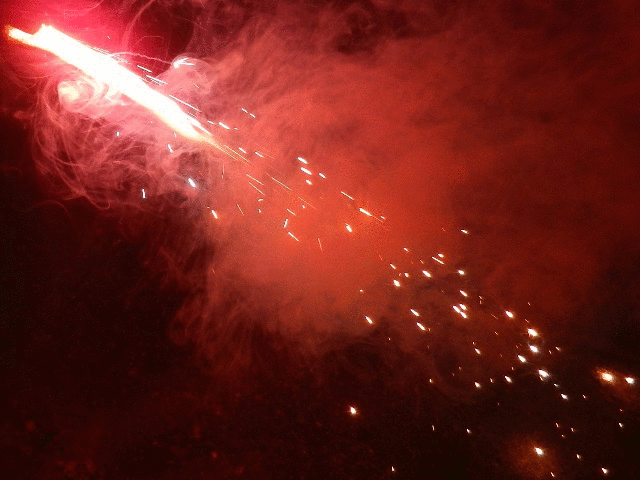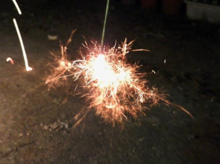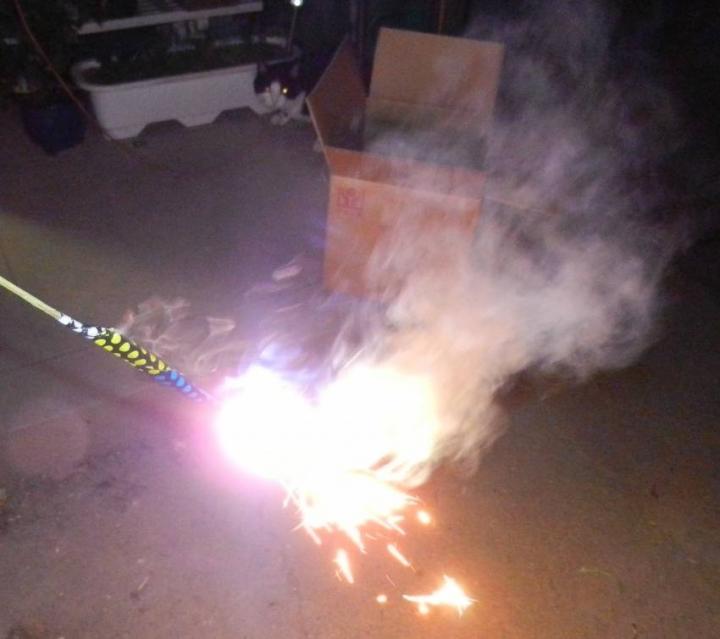 なるしゃんにリードを付けて,玄関につなぎ花火を始めた。