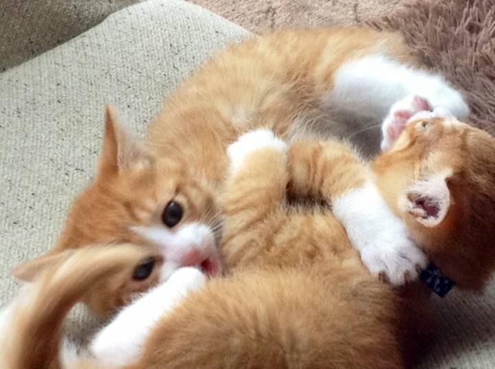 やんちゃな、アキくん、ハルくんに、飛び掛かり、じゃれ合って、
