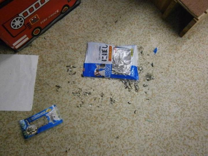 甘かった・・・頭が散乱・・かつおのオヤツはきれいに中身無し