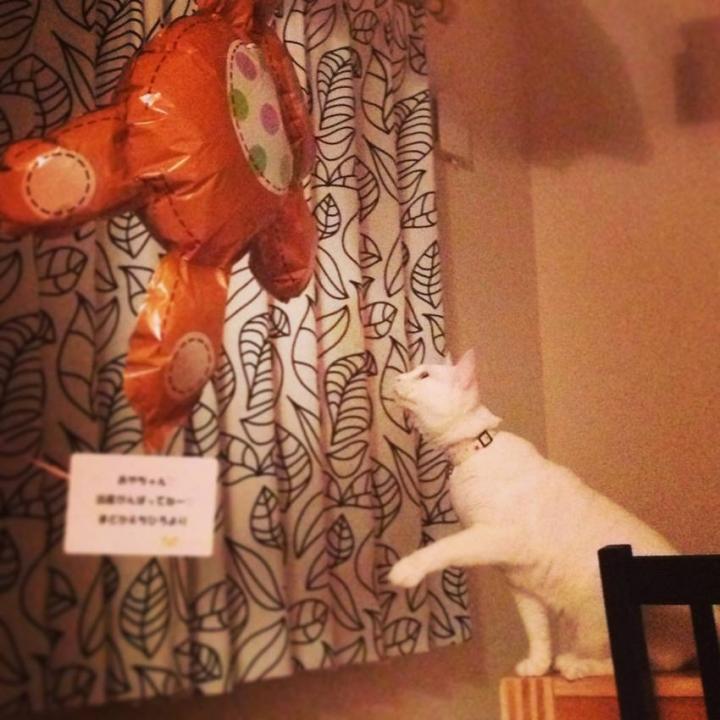 大きな大きなバルーンなんですが、初めは怖がって近付かなかったので安心してましたが、慣れて来て、ヒモをイタズラするようになったので、届かないように避難((((;゚Д゚)))))))