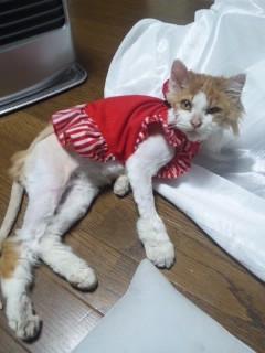 毛がなくて寒そうなので、ダイソーで買った服を着せられてるタヌ