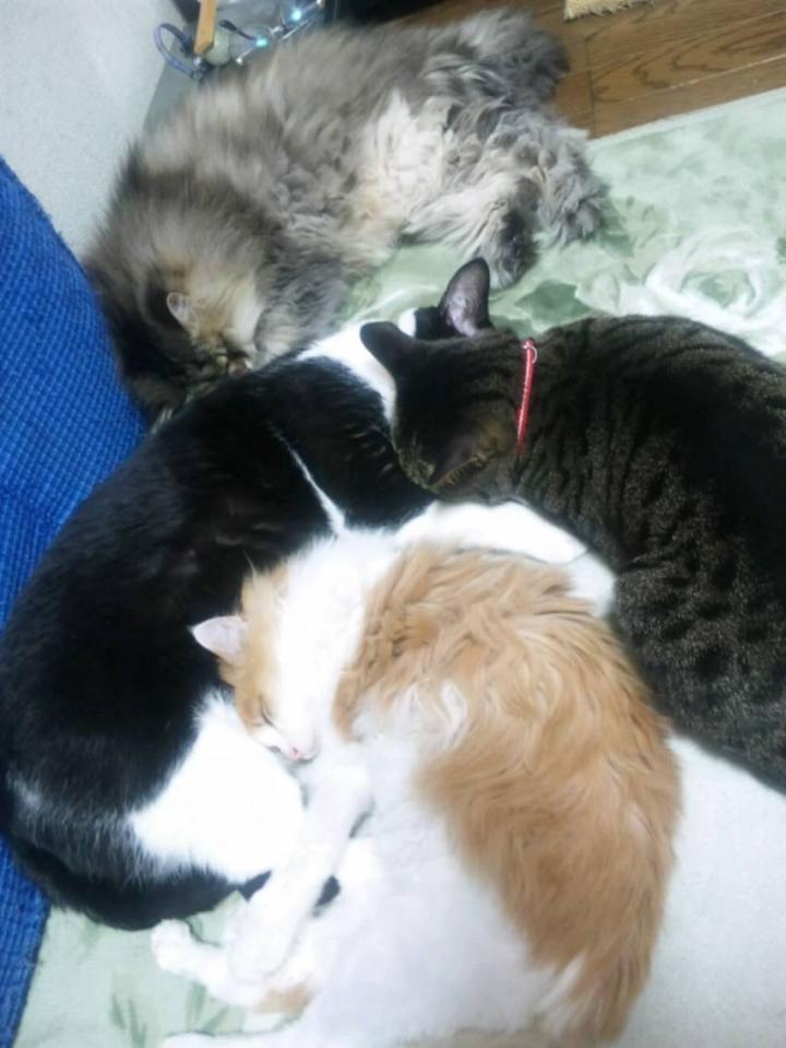 先住猫たちに警戒されながらも、自分から近づいて行き、いつしか一緒に眠るように