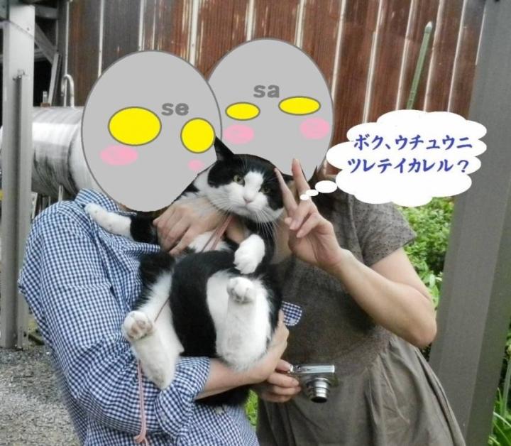 黒タンを抱っこし、ウチュウジンに見せる管理人。