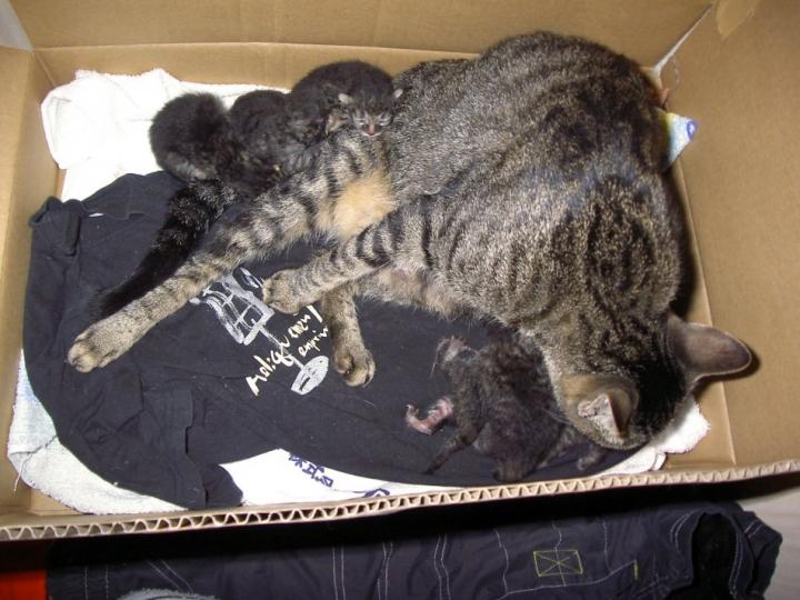 14歳のロシアンもどき巨猫フィ(♂)を筆頭に嫁の美猫カルネ、息子つばき、ぼたん。迷子のコギャル猫あやめも加わり大所帯・・・と思っていたら、あやめ(クロさん所の花のママ)がまた6プニー産んでまさに猫屋敷...