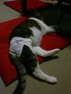 今日の夕方まで、ケージ生活を余儀なくされていたチビスケさんですが、ペット用オムツを購入してきたので、それを履いて解放されました。