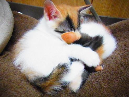 同じころ、白三毛ちゃんがくっきりちゃんをだっこしながらおねむでした。