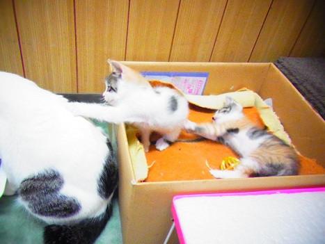 その白三毛ちゃんにちょっかいを出す縞三毛ちゃん。